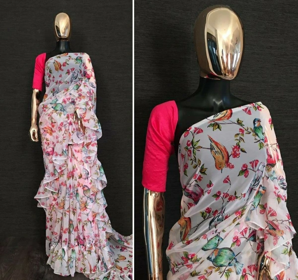 👉Saree Fabric : Georgette 👉Saree work : Printed with frill lace border 👉Saree length : 5.5 meter 👉Blouse : Banglory-Mulberry (1 meter unstitch)