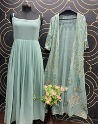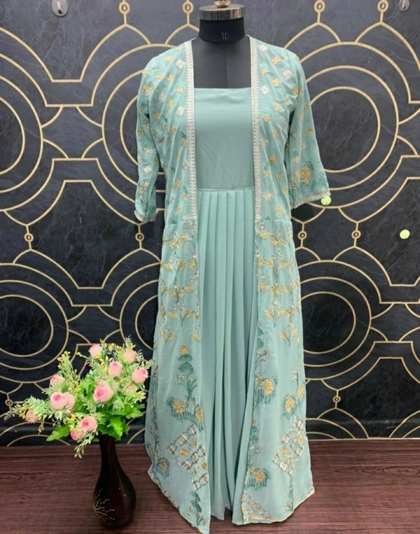 👉Gown Fabric : Georgette 👉GownInner : Santoon 👉Gown Flair:- 4 Mtr 👉Gown Length:- 55" 👉GownSize : Up To 44"(Sleeves Ava.) 👉GownType : Full-Stich 👉Koti Fabric : Georgette 👉KotiWork : Embroidery Work 👉KotiSize : Up To 44" 👉KotiLength:- 55" 👉KotiType : Full-Stich