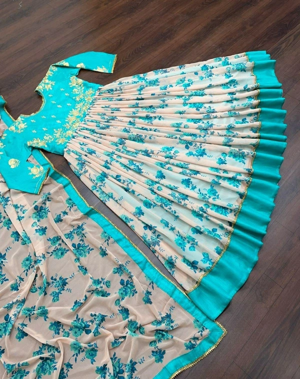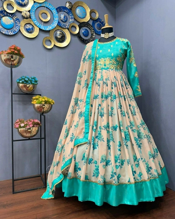 👉Gown Fabric : Georgette 👉Gown Work :Embroidery with Digital Print 👉Gown Inner :Crep 👉Gown Flair :- 3 Mtr 👉Gown Length : 57" 👉Gown Size :Upto 42 Fullstich 👉Gown Type : Full-Stich 👉Dupatta Fabric : Georgette 👉Dupatta Work :Printed 👉Dupatta Size : 2.10 MTR