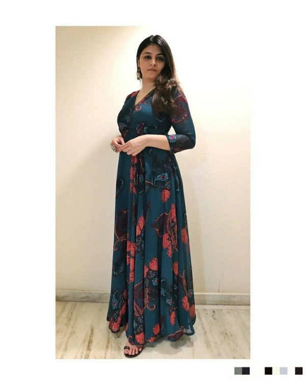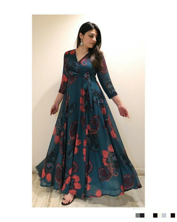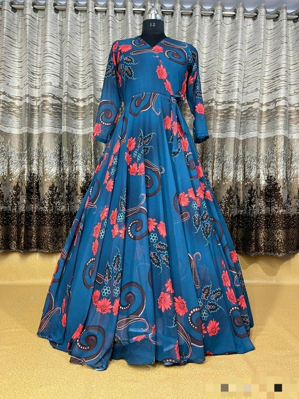 👉Gown Fabric : Heavy Georgette Silk 👉Gown Work : Digital Print 👉Gown Inner : Micro Cotton 👉Gown Size: Up to XL(XXL Margin) 👉Gown Flair : 8 MTR 👉Gown Length : 55" 👉Gown Type : Full Stitched